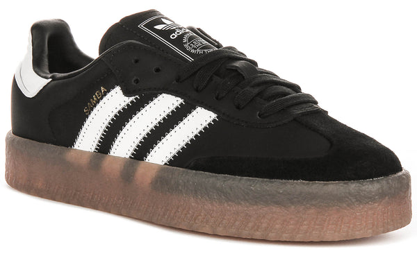 The Adidas Sambae trainers for women are a striking blend of classic style and modern design. Expertly crafted with a high-quality leather outer material, these trainers promise durability and a premium feel, making them a fantastic choice for both casual and athletic wear. Their sleek black body is accentuated by the bold white Adidas stripes, creating a timeless and versatile look that effortlessly complements various outfits.