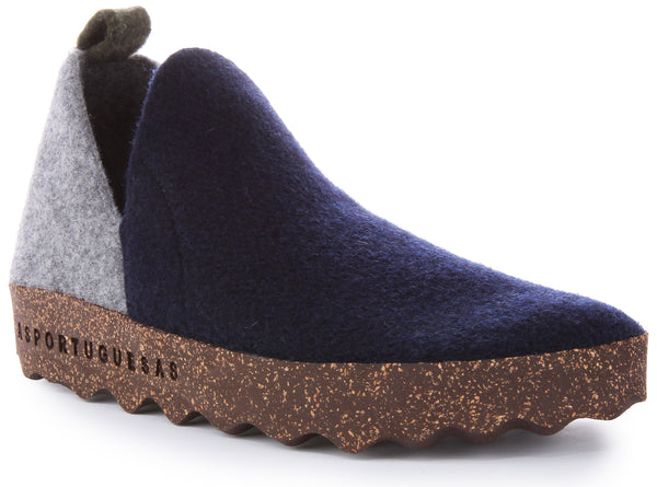 Crafted from wool felt, these shoes offer warmth and comfort, making them ideal for colder seasons. The navy and grey color combination adds a refined and versatile touch, suitable for casual and semiformal occasions. The Asportuguesas brand prioritizes sustainability, making these shoes an excellent choice for individuals who appreciate both style and ecofriendly materials.