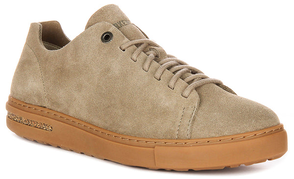 The **low-profile silhouette** is both contemporary and classic, offering a sleek and versatile look. The shoe's lace-up design ensures a snug and adjustable fit, while the subtly embossed Birkenstock branding adds a touch of authenticity and elegance. The minimalist stitching details and clean lines highlight its premium craftsmanship.