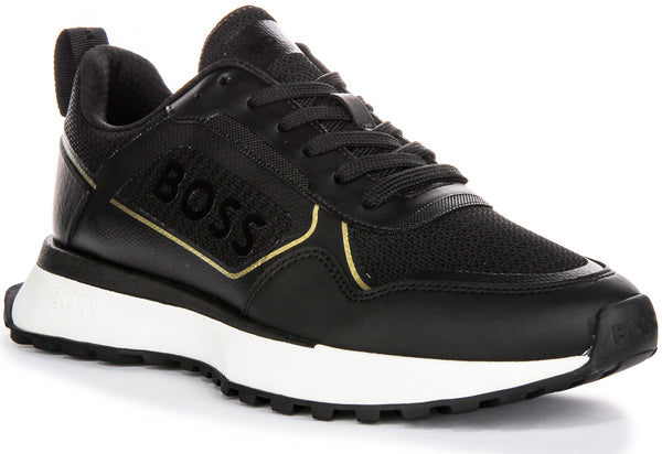 These trainers are tailored specifically for men and embody the distinctive elegance associated with the Boss brand. The contemporary black colour is accented with subtle gold detailing, giving the trainers a sophisticated yet sporty look. The logo is prominently displayed on the side, adding a touch of brand recognition that complements the sleek design.