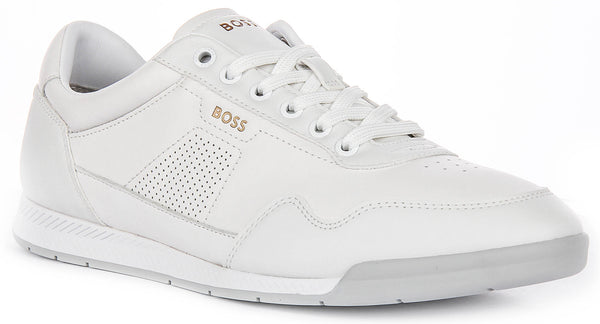 Crafted with a premium textile outer material, these trainers boast a crisp white finish that is both versatile and undeniably chic. The material appears smooth and durable, providing a clean canvas for the shoe's subtle design features. The pristine white is complemented by a contrasting grey on the front toe cap of the sole and on the outsole, offering a contemporary edge, while the eye-catching gold Boss branding provides a luxurious touch on the side panel, tongue, and heel.