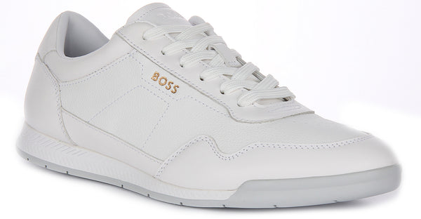 The all-white design is accentuated with subtle gold-tone "BOSS" branding on the side, adding a touch of luxury to the minimalist profile. The stitching details throughout provide a textured element, enhancing the overall aesthetic without compromising the sleekness of the design.