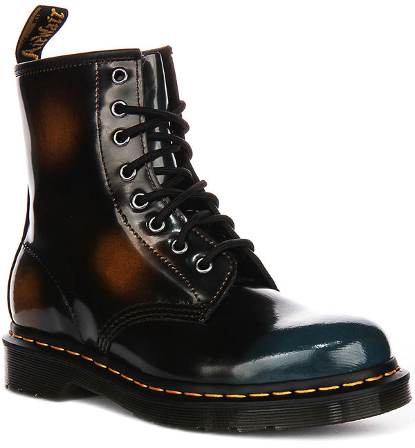 The classic 1460 design features an 8-eyelet lace-up system, providing a secure and customizable fit. The black laces contrast beautifully with the polished leather, creating a visually appealing and cohesive look. The yellow stitching around the sole is a signature detail of Dr Martens, adding a touch of authenticity and brand recognition to the overall design.