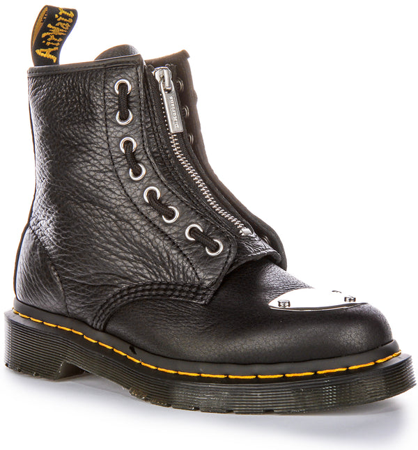 Crafted from premium black leather, these boots feature a unique metal toe plate detail that adds a touch of industrial edge to the classic silhouette. The 8 eye lace up design ensures a secure and adjustable fit, while the durable construction.