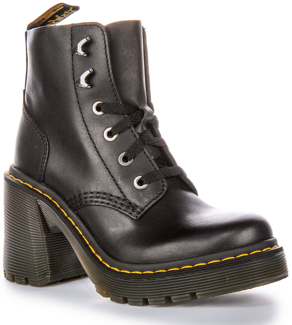 The six eye lace up closure adds a touch of rugged charm, while the chunky heel provides both height and stability. Crafted from premium black leather, these boots feature a sleek silhouette with a hint of rebellion, characteristic of the Dr. Martens brand.