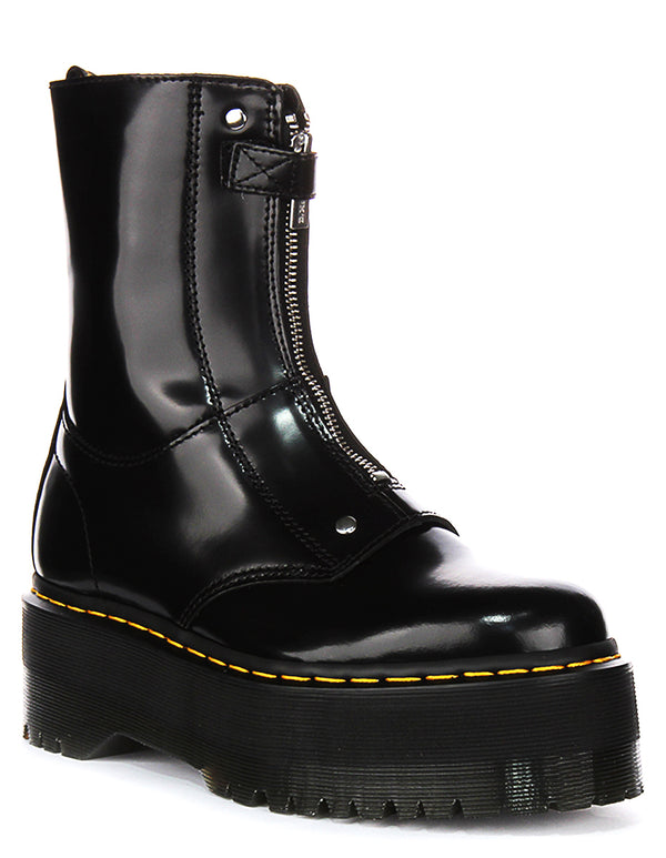 These ankle boots are made from high-quality leather as the outer material, giving them a sleek and glossy finish. The black leather is both durable and stylish, offering resistance to wear while maintaining a polished and modern look. Featuring prominent stitching and signature design details such as the visible yellow welt stitching, these boots epitomise unmistakable Dr Martens style. The central zip fastening on the upper front enhances the aesthetic appeal while also allowing for easier wearability.