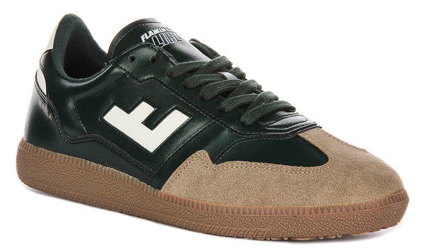 These trainers feature a sleek, low-profile silhouette, making them suitable for a wide variety of outfits and occasions. The outer material is entirely vegan, offering a cruelty-free alternative to traditional leather while maintaining durability and a premium finish. The dark green upper is complemented by beige suede-style panels on the toe, adding both texture and visual interest. White accents, including the signature ‘F’ branding and heel detail, provide a fresh contrast against the rich tones of the shoe.