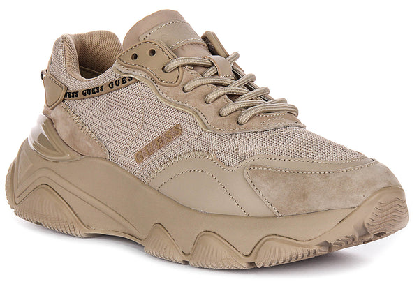 Adorning the trainers is subtle branding, including the word "GUESS" embossed along the sides and printed on the strip running across the heel. The design adds an understated yet fashionable touch. The layered construction and dynamic panelling provide depth and highlight the trainers' sporty aesthetic.