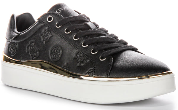 These trainers are crafted from high quality faux leather, offering a sleek and durable exterior that is both fashionable and animal friendly. The classic black color is elegantly contrasted by the iconic Guess 4G Peony logo, adding a touch of luxury and brand recognition. Designed with a low cut silhouette, these trainers provide a comfortable and snug fit, perfect for all day wear.