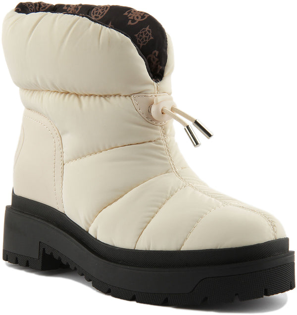 Stand out in these Leeda ankle boots from Guess. Made from padded synthetic material, these boots feature round toe design and drawstring fastening. It has leather insole and fabric lining for comfort, while the rubber outsole ensures maximum grip. Finished with 4G logo at the back, these boots are perfect for any casual occasion.