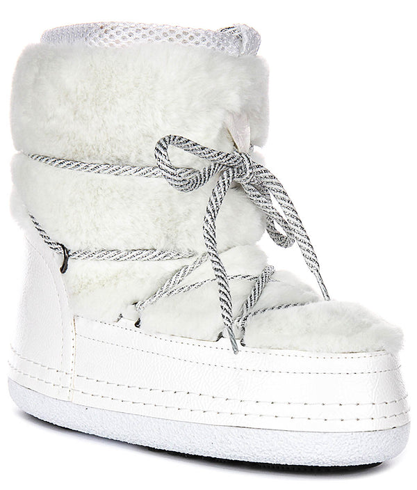 The trainers feature a mid-rise boot design, which provides added warmth and coverage during colder days. The fur-like details on the trainer's upper and inner lining make it a cosy choice, ideal for cooler seasons. The addition of two-tone laces not only secures the fit but also complements the overall aesthetic with a playful, sporty touch.
