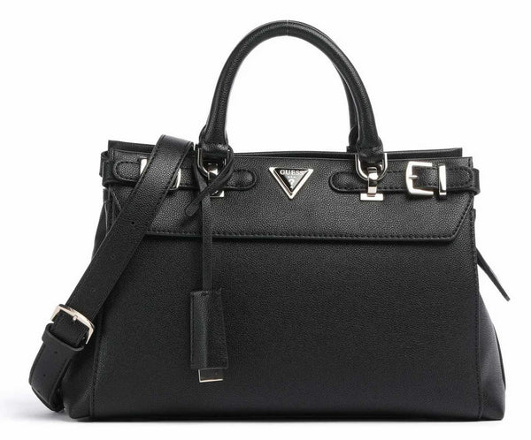 The bag features a structured silhouette with sturdy double handles, ensuring a comfortable grip when carried by hand. Additionally, it comes with an adjustable, detachable shoulder strap, offering versatile styling options. Whether you prefer to carry it as a handbag or a shoulder bag, it adapts seamlessly to your preferred look. The silver-toned hardware, including eye-catching buckles and the iconic Guess logo, enhances its contemporary and sophisticated appeal.
