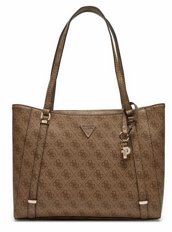 The tote features an all-over monogram pattern in a versatile taupe shade and is accented with the iconic Guess triangular logo on the front. This gives the bag a classic and luxurious feel, synonymous with the Guess brand. Additionally, the handbag is adorned with a sleek keychain detail for an extra hint of charm and individuality.