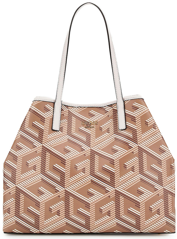 Simple yet versatile and stylish handbag from Guess. It is made from G cube logo print faux leather upper with polyurethane lining. It features twin top handle for easy wear and magnetic snap closure. It is a spacious handbag for all your essentials with a removable zippered pouch. Pair them with your best denim or a dress and get your desired smart or casual look for the day.