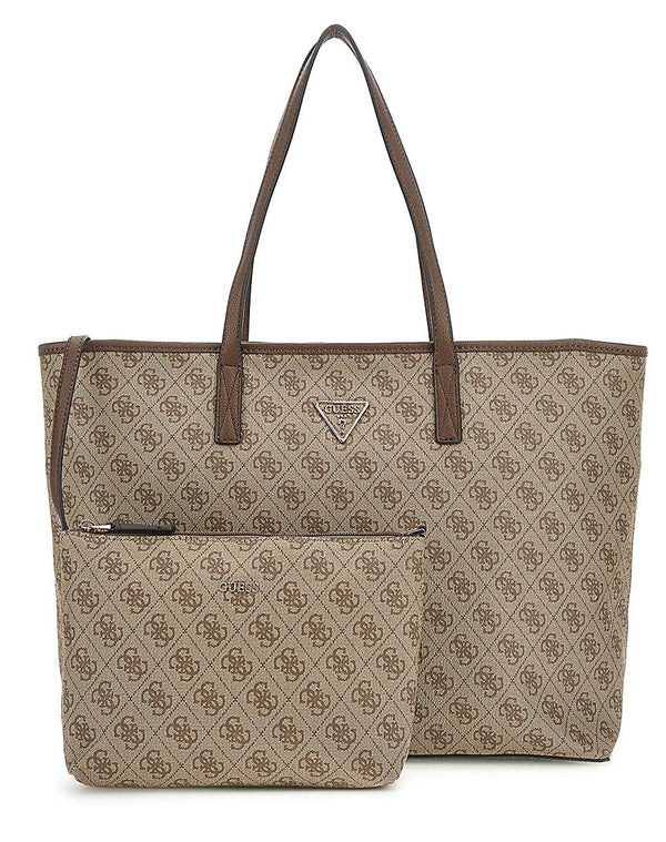 The elegant latte color provides a timeless and chic backdrop, making it a versatile addition to any wardrobe. The exterior features the iconic Guess 4G logo embossed into the material, adding a textured and refined element to the design.