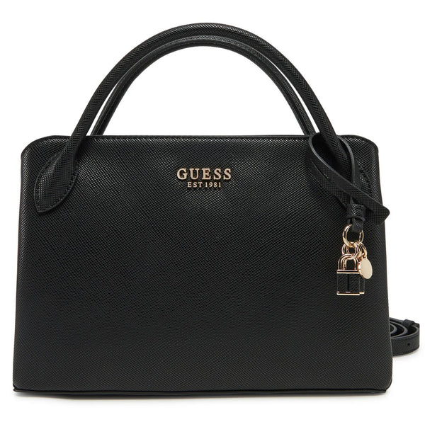 The front of the bag is adorned with the iconic Guess logo in gold-tone metal, which pairs beautifully with the matching gold hardware details, including a chic decorative padlock charm. The sturdy double top handles offer comfortable carrying, while the detachable and adjustable shoulder strap allows for effortless versatility, so you can wear it your way – whether over the shoulder or carried by hand.