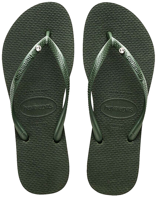 Crafted with a thinner sole for a sleeker profile, they offer a more refined look while still providing the comfort and durability Havaianas is known for. The olive green colorway adds a subtle pop of color to any outfit, making these sandals perfect for both casual and dressier occasions.These sandals feature delicate crystal detailing along the straps, adding a hint of sparkle to your ensemble.
