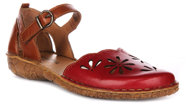 Crafted with high-quality leather, the outer material of these sandals exudes a rich and sophisticated appearance. The contrasting red and brown tones add a splash of colour while maintaining a classic look. The upper part of the sandal is adorned with intricate cut-out patterns in the shape of flowers, adding a touch of femininity and flair.