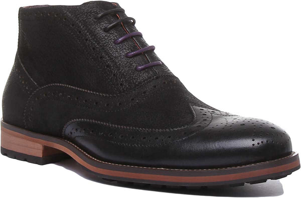 Put a statement in your step with these Justin Reess Bruno mens brogue lace up boots with zip on the side. A beautiful brogue with tan leather upper on a durable leather and rubber sole unit. Lace up closure with zip on the side helps in adjustable fit according to your need. These ankle boots are made to compliment a casual or smart outfit and give you that standout look. Perfect addition to your wardrobe.