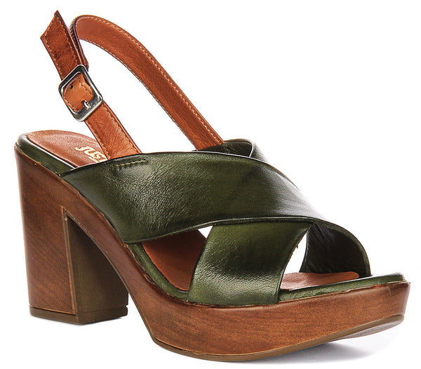 The Enya sandal is a versatile and chic choice for women looking for a fashionable yet comfortable heel. The combination of the olive green leather and wooden heel creates a sophisticated and timeless look that can be dressed up or down for various occasions.