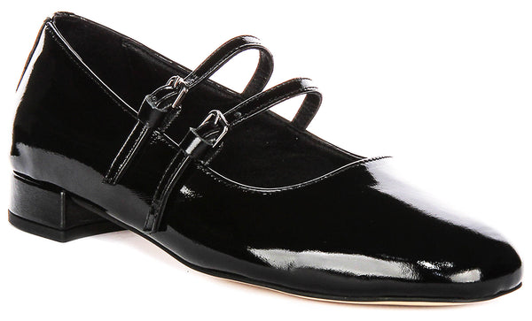 The Justinreess England Kalie shoes are crafted from high-quality leather, providing a sleek and polished appearance. Designed for women, these shoes feature a classic Mary Jane style with double straps, adding a touch of elegance to any outfit. The glossy finish enhances their stylish look, making them suitable for both formal and casual occasions.