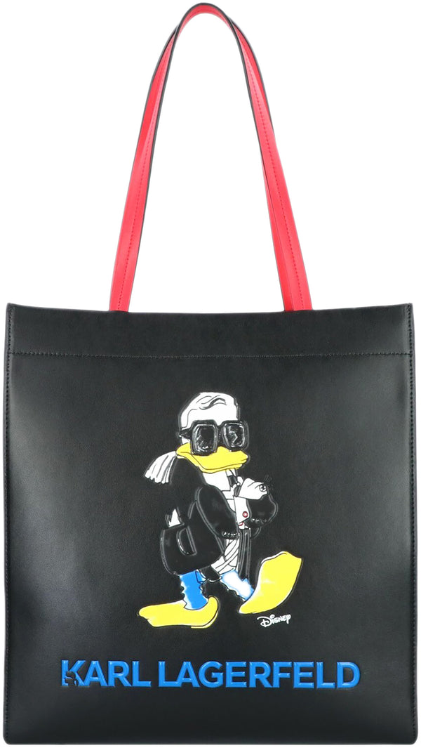 Perfect for everyday use, these Disney inspired tote bags are made from synthetic upper with Donald Duck print on the front. It features magnetic button closure and two flat top handles for easy and comfortable carrying. Finished with Karl Lagerfeld branding, these spacious tote bags are ideal for Donald Duck and Karl fans.