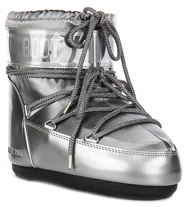 The Moon Boot Women's Icon Low Glance ankle boots are a stylish and futuristic footwear option, designed to combine both fashion and function. Made from durable nylon, the boots are built to withstand various weather conditions while providing optimal comfort and warmth. The glossy silver finish and sleek design give them a modern, eye-catching appeal that stands out.