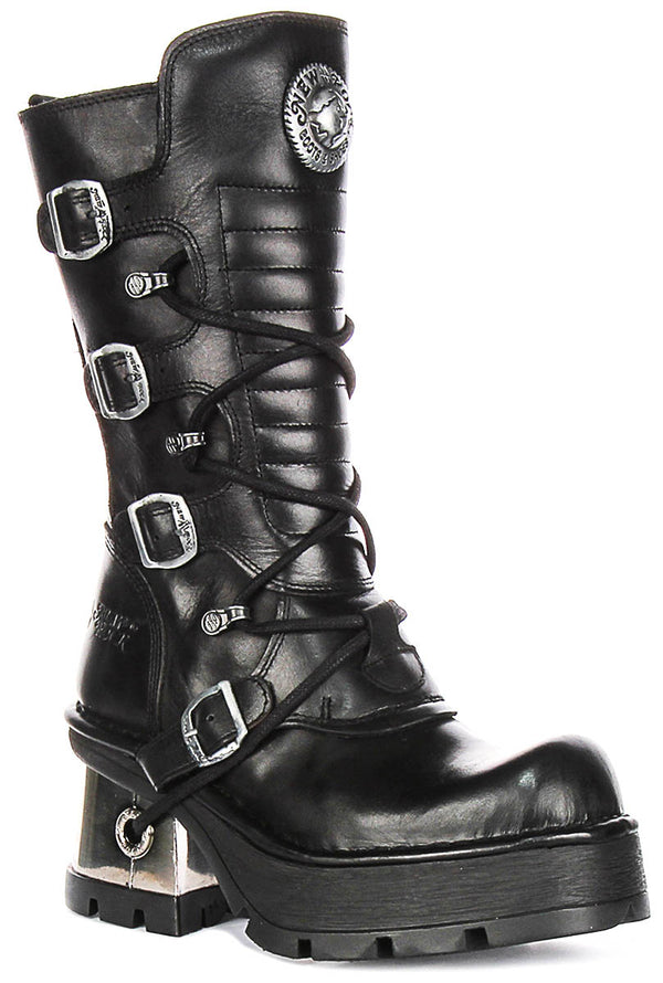 Introducing the 373 New Planing Ankle Boots by New Rock, a striking footwear choice for those who appreciate a bold, alternative aesthetic. Expertly crafted from high-quality leather, these boots are designed for unisex wear, offering both style and durability for all. The classic black leather finish is complemented by distinctive metallic elements, setting these boots apart as a true statement piece.