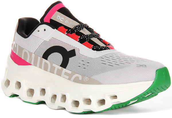Additional details include stylish contrast laces, subtle branding, and a reinforced heel for extra support and durability. The outsole is engineered with strategically placed rubber grips in green, ensuring reliable traction on a variety of surfaces. Perfect for running, gym sessions, or everyday wear, the On Running Cloudmonster Mesh Trainers provide a unique blend of style, performance, and comfort for women seeking high-quality footwear.