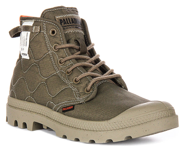 Additionally, the boots include subtle branding details that enhance their aesthetic without being overly bold. The neutral tones of the canvas material give them a versatile appearance that can be easily paired with a variety of outfits. Whether you're heading out for a casual day in the city or a countryside walk, the Palladium Pampa Re-quiltd boots deliver both style and functionality.