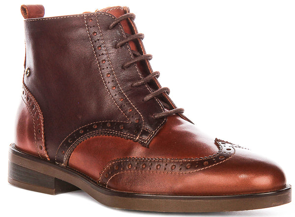 These elegant ankle boots feature classic brogue detailing, including decorative perforations and intricate stitching along the wingtip toe cap, vamp, and side panels, adding a touch of timeless sophistication. The front is secured with sturdy, tonal brown laces, allowing for a personalised and snug fit. The careful craftsmanship is evident in every stitch, highlighting the quality that Pikolinos is renowned for.