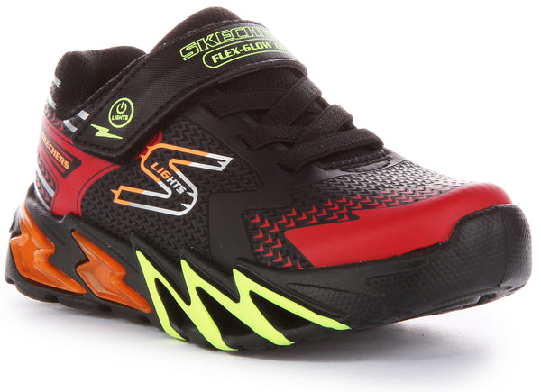 Stand out in cool style and comfort with Skechers S Lights: Flex-Glow Bolt shoe. Made from an athletic synthetic and mesh upper with lightening bolt and zigzag detail midsole, these slip-on trainers feature stretch laces with single hook and loop strap closure. Completed with flexible rubber traction outsole, these light-up trainers are perfect for everyday wear.