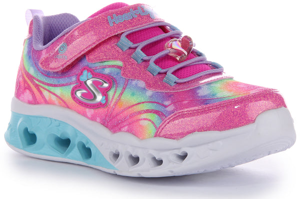 Brighten your steps with heart-filled style wearing Skechers Flutter Heart Lights- Groovy Swirl shoes. Made from multicolor glitter print fabric upper with synthetic glitter overlays, it features stretch laces with hook and loop strap. These lightweight slip-on sneakers have flexible rubber traction outsole and cushioned midsole with 3D sculpted light-up hearts. Perfect for casual wear.