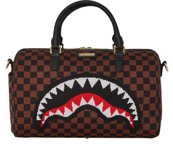 The duffle bag features a striking checkerboard pattern in shades of brown, which is further enhanced by the iconic shark mouth motif on both sides. This bold graphic design not only adds a unique flair but also signifies the brand's distinctive aesthetic. The bag's exterior is complemented by sturdy black handles, offering a comfortable grip for easy carrying.