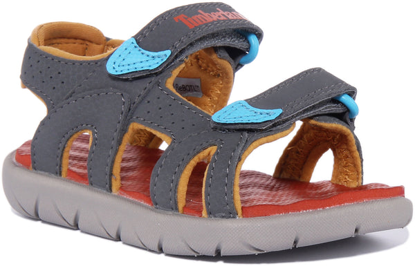These kids’ Perkins Row Strap sandals from Timberland are made from synthetic leather and ReBOTL recycled fabric for less impact on the environment. It features hook and loop closure for adjustable and secure fit. Tiny feet stay supported and cushioned by the EVA footbed and outsole. Perfect sandals for kids for a day out.
