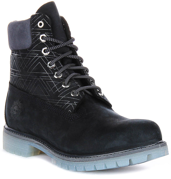 The boots feature a premium nubuck leather exterior, known for its soft texture and durability. The rich black colour is complemented by a geometric pattern on the upper panel, giving them a contemporary and distinctive aesthetic. The heel collar is padded with a soft, contrasting material that enhances comfort and prevents abrasion.