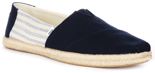 Crafted from durable canvas material, these espadrilles provide a lightweight and breathable feel, ideal for warm weather. The understated yet stylish combination of solid navy canvas at the front and striped canvas panels on the sides adds a timeless touch, making them a great pairing option for a variety of outfits. The signature Toms tag is subtly placed on the side, further enhancing their recognisable charm.