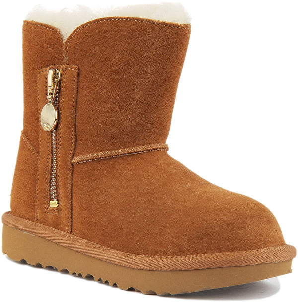 This kid’s Bailey Boot is more versatile than ever, featuring a convenient lateral zipper for easy on and off. These boots are lined with sheepskin and signature Uggplush wool blend for comfort and warmth. Finished with a cushioned Treadlite by Ugg outsole, these boots are a perfect choice for all day wear.