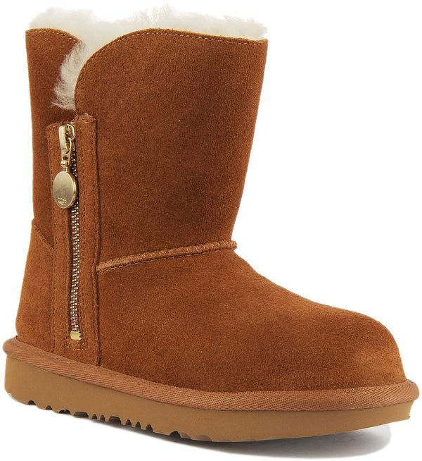 This kid’s Bailey Boot is more versatile than ever, featuring a convenient lateral zipper for easy on and off. These boots are lined with sheepskin and signature Uggplush wool blend for comfort and warmth. Finished with a cushioned Treadlite by Ugg outsole, these boots are a perfect choice for all day wear.