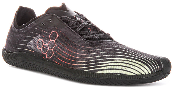 The sophisticated synthetic upper of these trainers features a predominantly black base, providing a versatile and sharp look. This is dynamically enhanced by a striking wavy line pattern that sweeps across the vamp, transitioning from vibrant red and orange hues at the midfoot to a subtle light green or yellow tone towards the toe. The iconic Vivobarefoot hexagonal logo is prominently displayed on the side in a matching coral red, adding a distinctive brand touch. The minimalist lacing system integrates seamlessly into the design, ensuring a snug and secure fit with a refined profile.