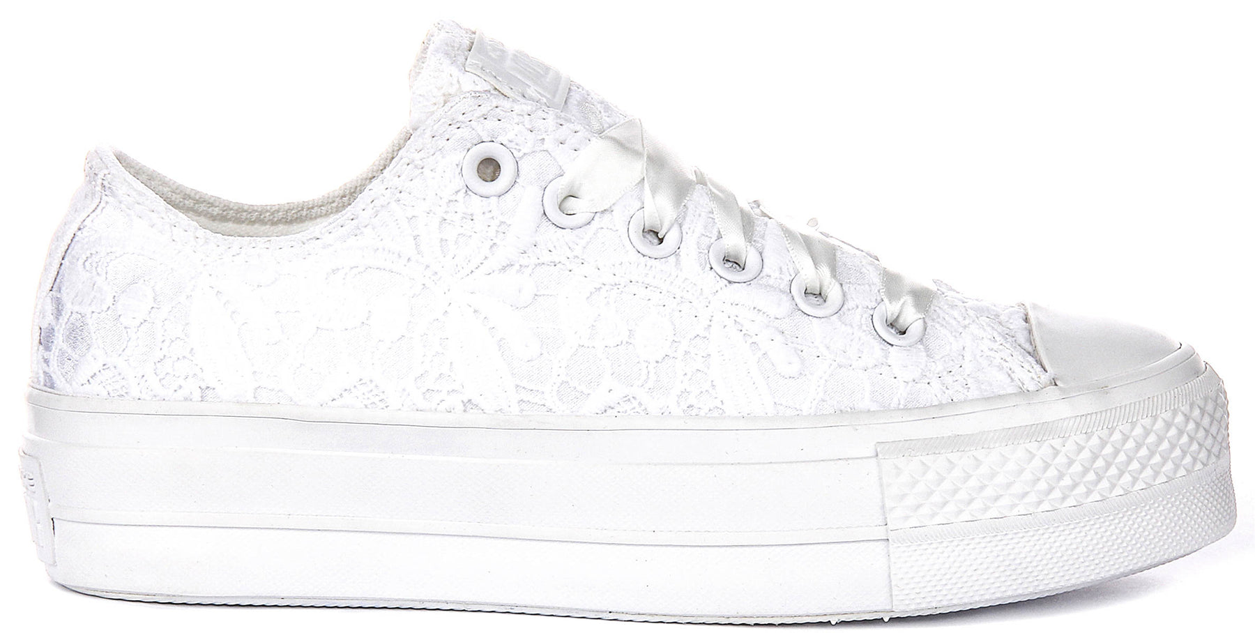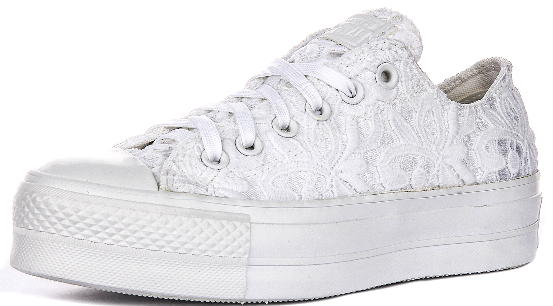 The distinctive outer material of these trainers is a beautifully detailed textile, showcasing an intricate, delicate lace-like pattern across the entire upper. This unique design provides a sophisticated texture and visual interest, elevating them beyond typical canvas trainers. Further enhancing their elegant appeal are wide, flat satin ribbon laces, threaded through pristine white metal eyelets, offering a luxurious touch and an alternative to standard athletic lacing. The classic white rubber toe cap signature to Converse design remains a core feature.