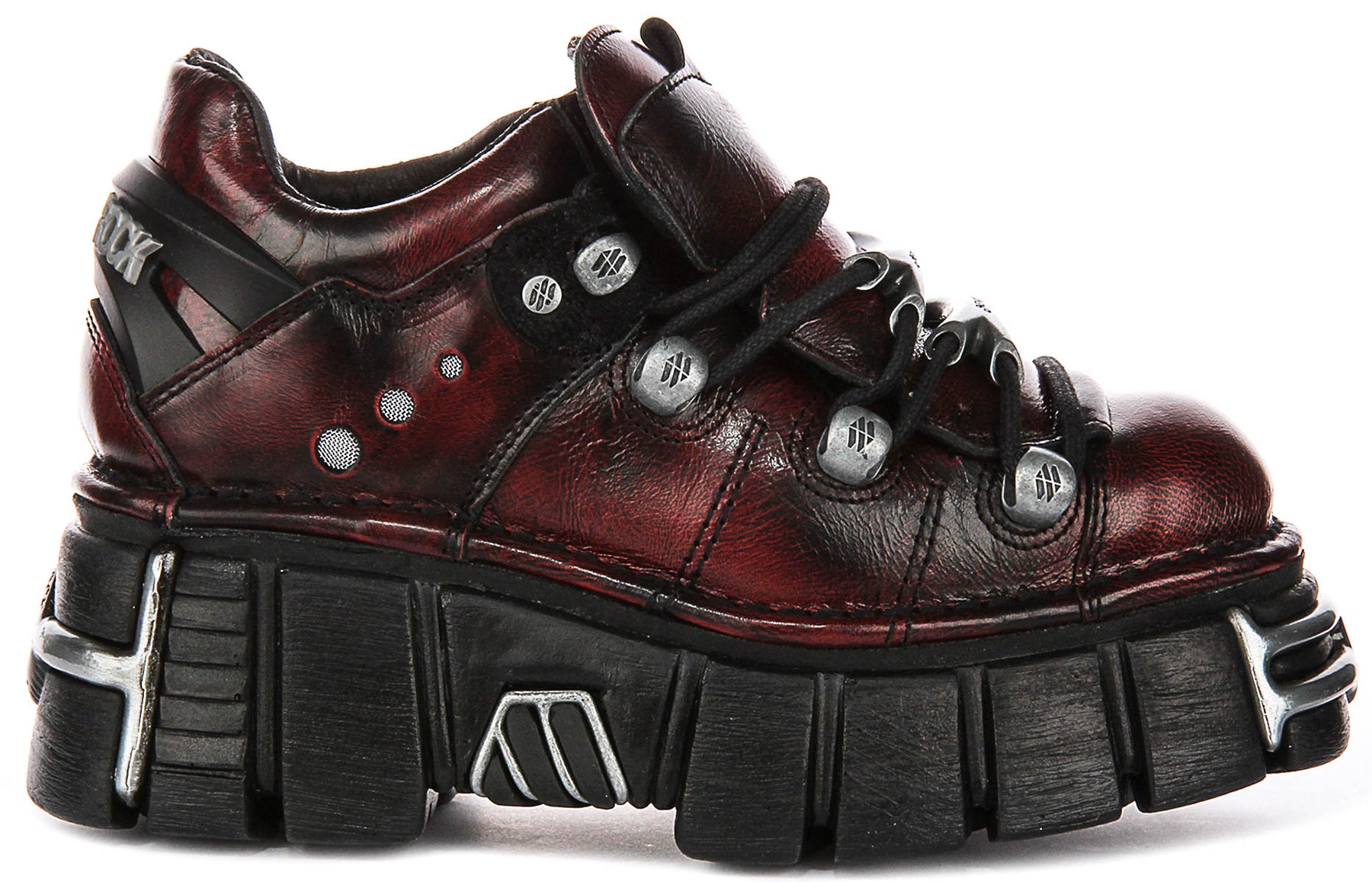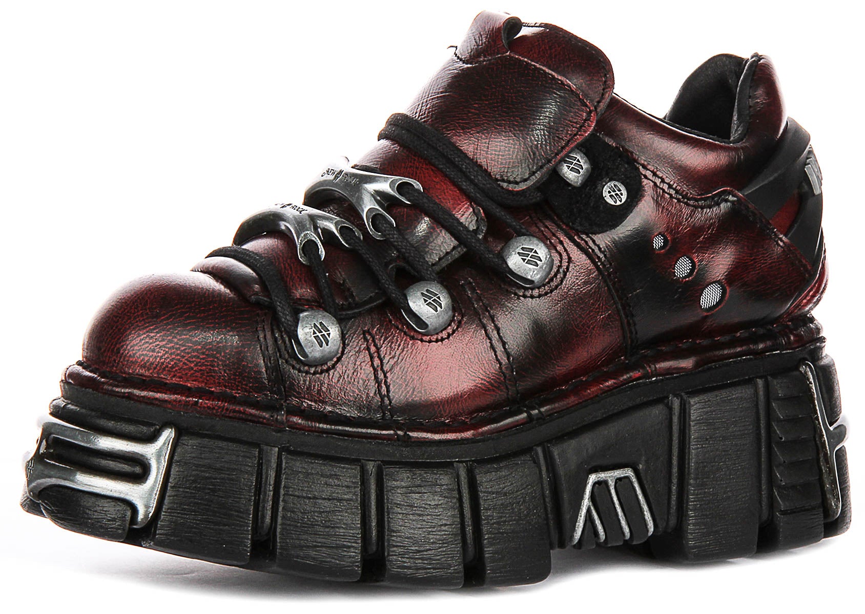 Crafted from high-quality synthetic materials, the 120 Tower showcases a rich, deep red outer with black undertones, giving the shoe an industrial, almost metallic sheen. The chunky platform sole is a standout feature, featuring rugged grooves and bold metallic accents, enhancing both the shoe’s unique character and its overall durability. These details create a powerful visual impact while providing substantial lift and support.