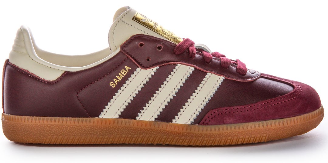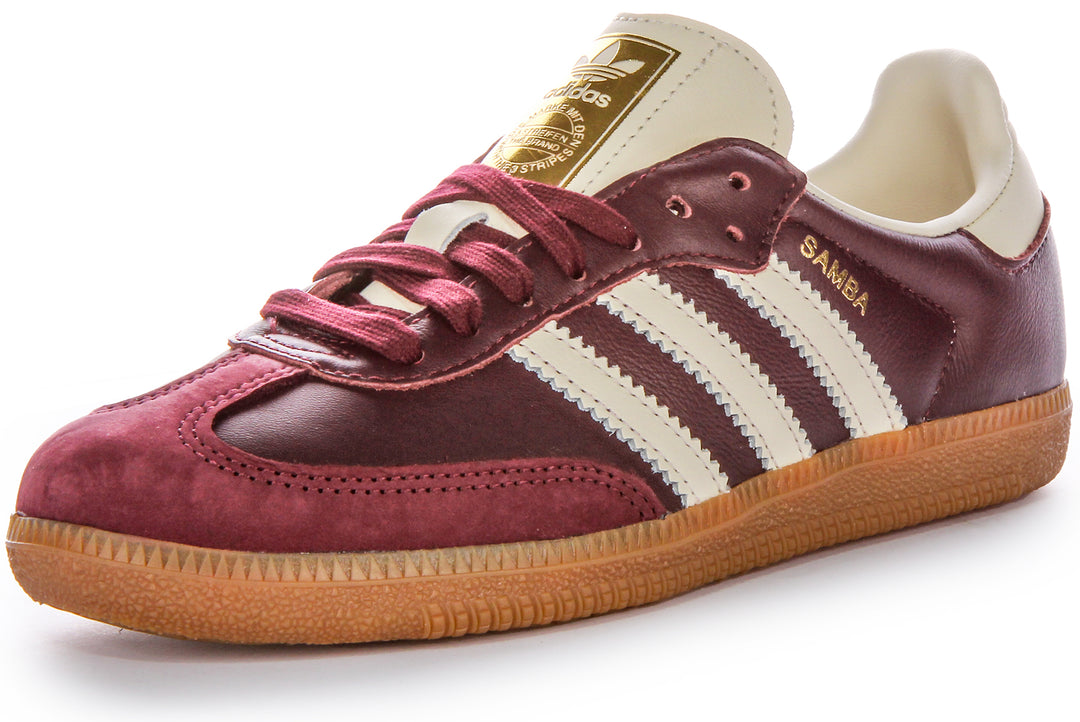 Diese Sneaker präsentieren sich in einer klassischen Bordeaux Farbgebung, die Retro Charme ausstrahlt, während die Lederverarbeitung Langlebigkeit und Premium Qualität bietet. Der Schnürverschluss sorgt für eine sichere Passform, während der gepolsterte Kragen und das gepolsterte Fußbett ganztägigen Tragekomfort und Halt bieten. Das ikonische Adidas Samba Design mit seiner charakteristischen Wildleder Überlagerung und der Gummilaufsohle verleiht Ihrem Ensemble Authentizität und Stil.