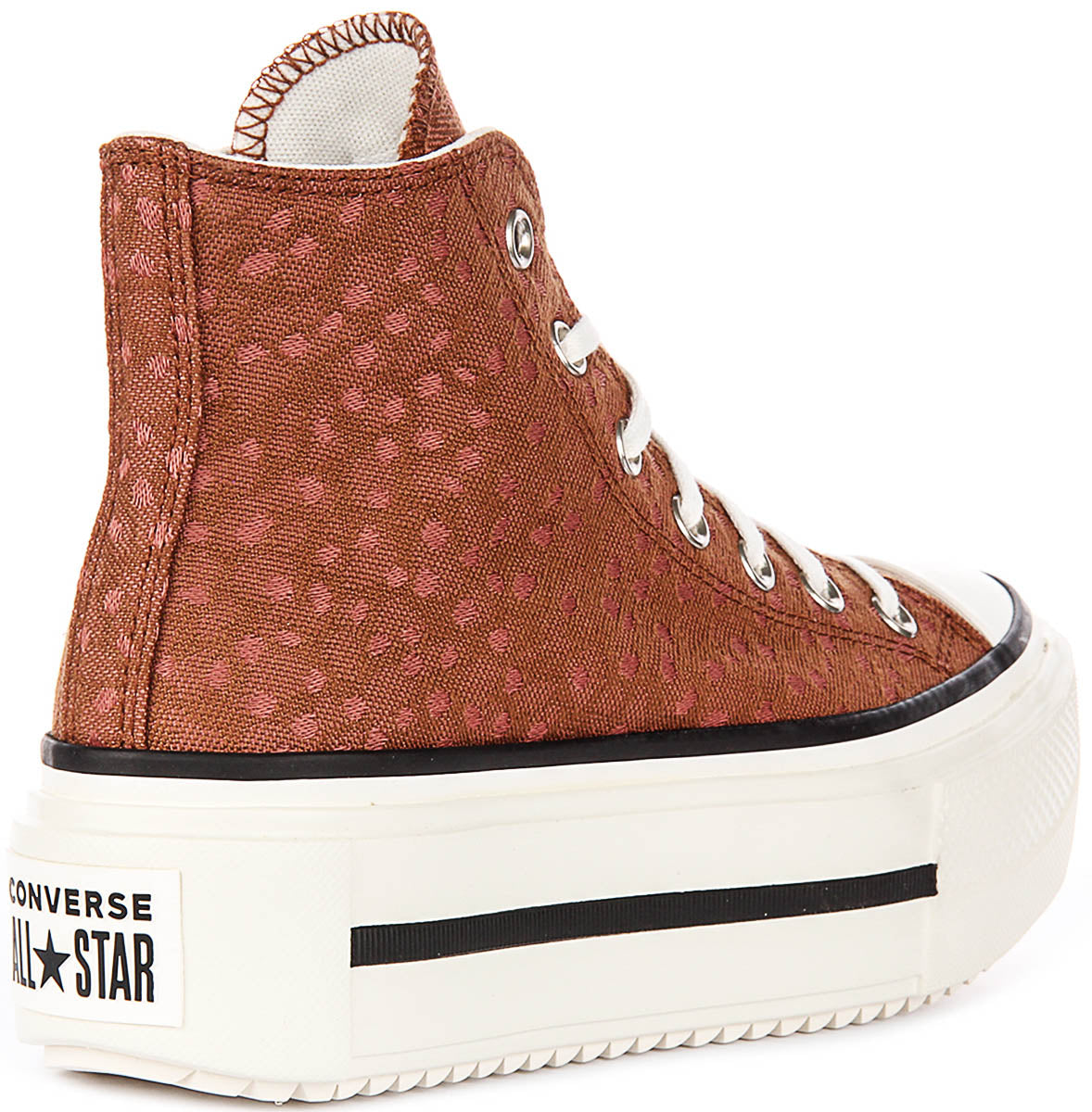 Introducing the Converse A17883C, a striking high-top trainer that combines the iconic silhouette of the legendary Converse All Star with a contemporary platform sole design. This unisex trainer is crafted from a rich brown textile material that delivers both durability and a refined aesthetic. The textured fabric upper showcases a subtle woven pattern that adds visual interest and depth to the shoe, making it a versatile choice for a wide range of personal styles and wardrobes.
