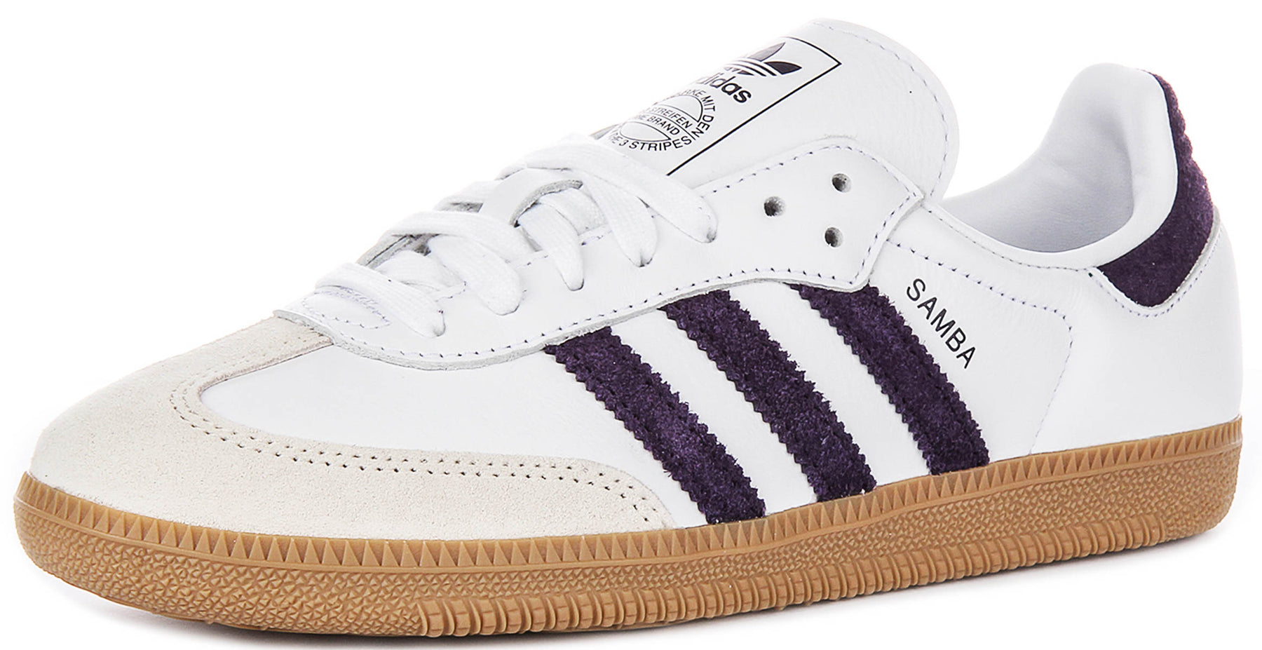 Signature Adidas branding details are prominently displayed, including the classic three stripes in a rich, dark purple suede-like material adorning the sidewalls. The "Samba" model name is elegantly printed in black lettering alongside these stripes, celebrating its enduring legacy. The tongue features the iconic Adidas trefoil logo, further cementing its authentic design. The heel tab and interior collar also showcase the matching dark purple suede-like material, adding a refined pop of colour and tactile interest.