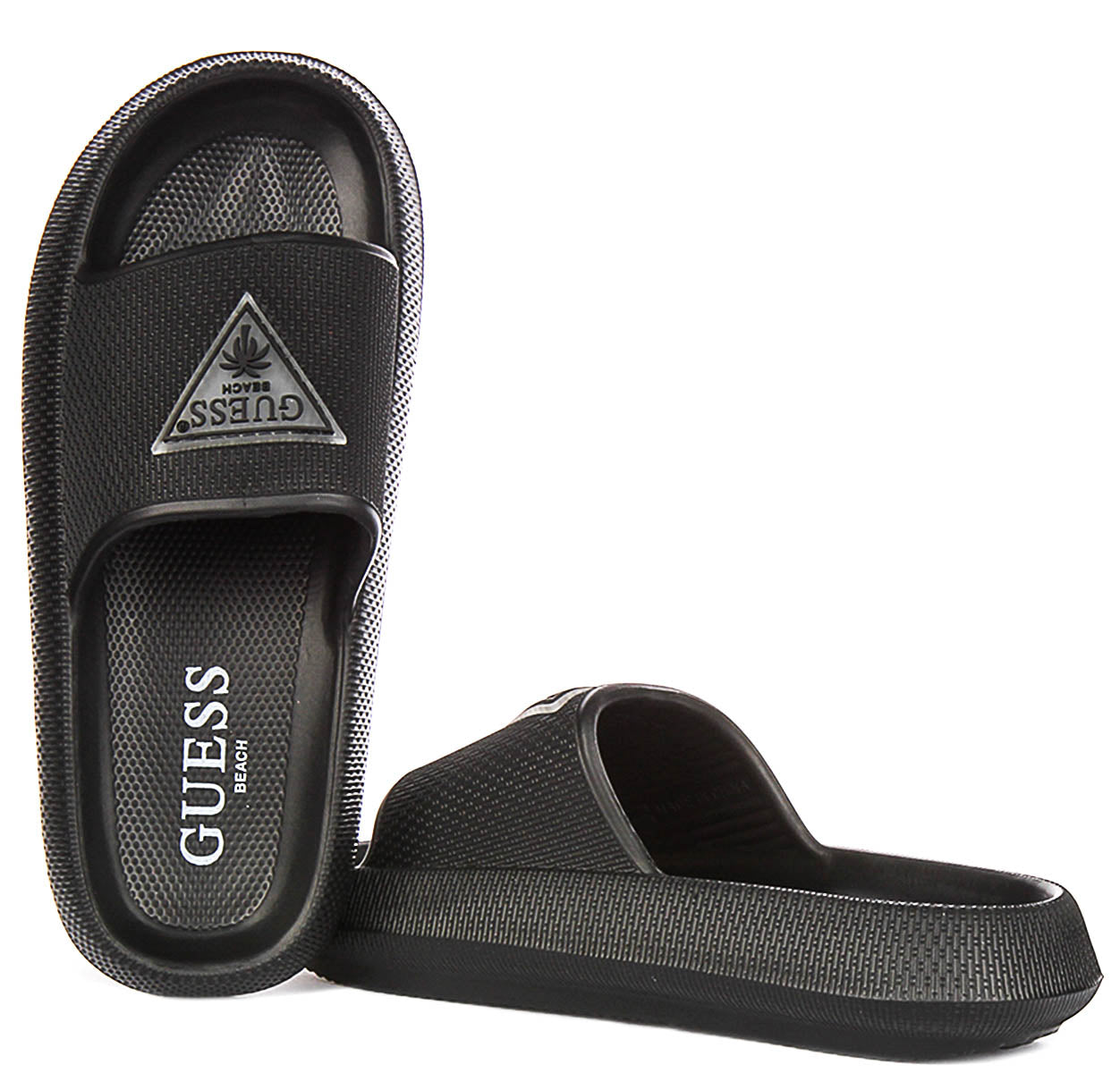 The design features a wide, single-strap upper that securely holds the foot. This strap is enhanced with a subtle textured pattern, adding a touch of sophisticated detail. A distinctive triangular emblem, bearing the iconic Guess logo along with 'Beach' lettering and a palm tree motif, is prominently placed on the strap, highlighting the brand's signature style and the sandal's leisure-oriented appeal.