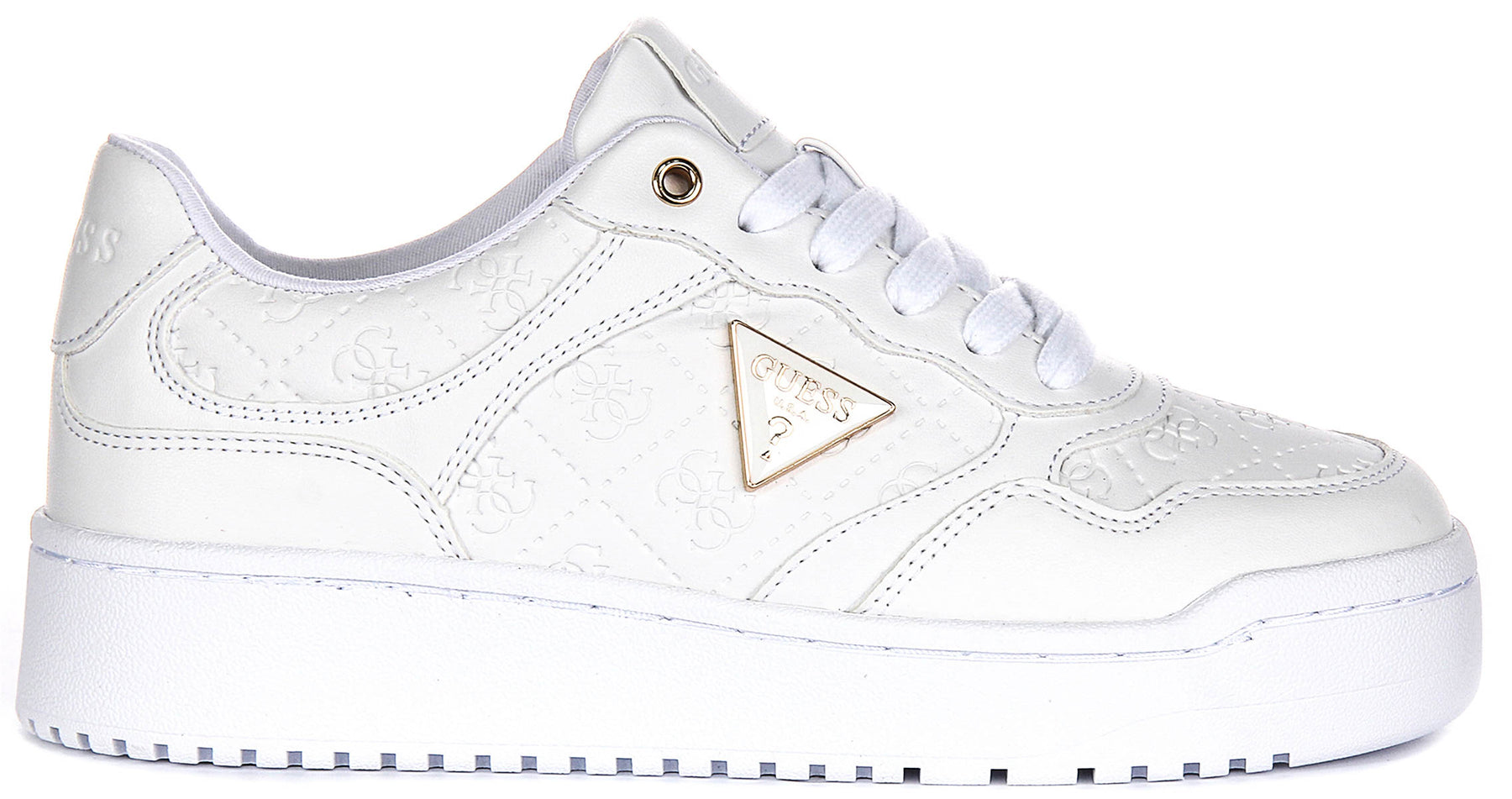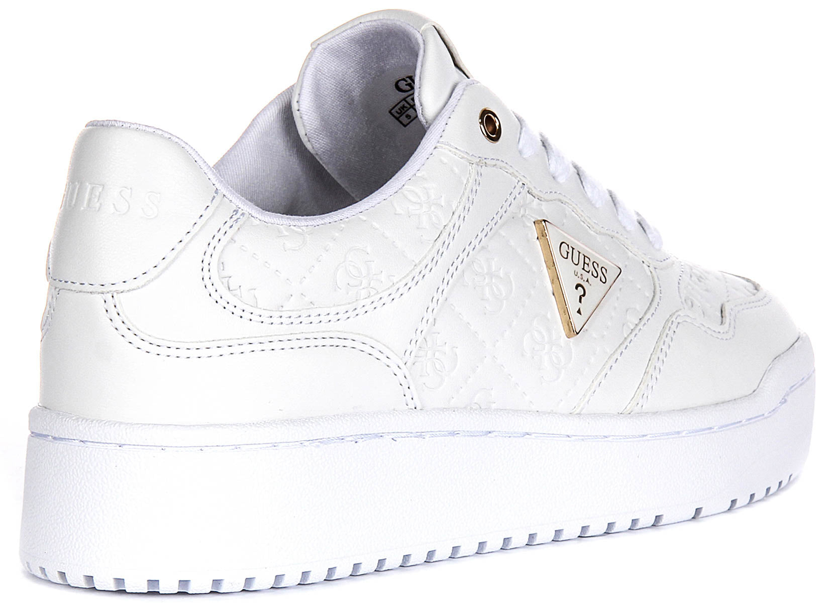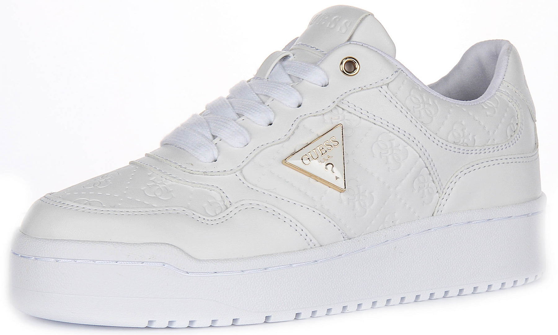 Step out in style with these Guess Women's Faux Leather Trainers, model FLJMI6FAL12, designed to blend modern fashion with everyday comfort. These trainers feature a crisp, all-white design that ensures versatility, allowing you to pair them effortlessly with your favourite outfits, whether casual jeans or sporty attire. The iconic Guess branding is beautifully showcased with the signature metallic triangle logo on the side and subtle embossed logos throughout the upper, lending a touch of luxury and recognisable flair.