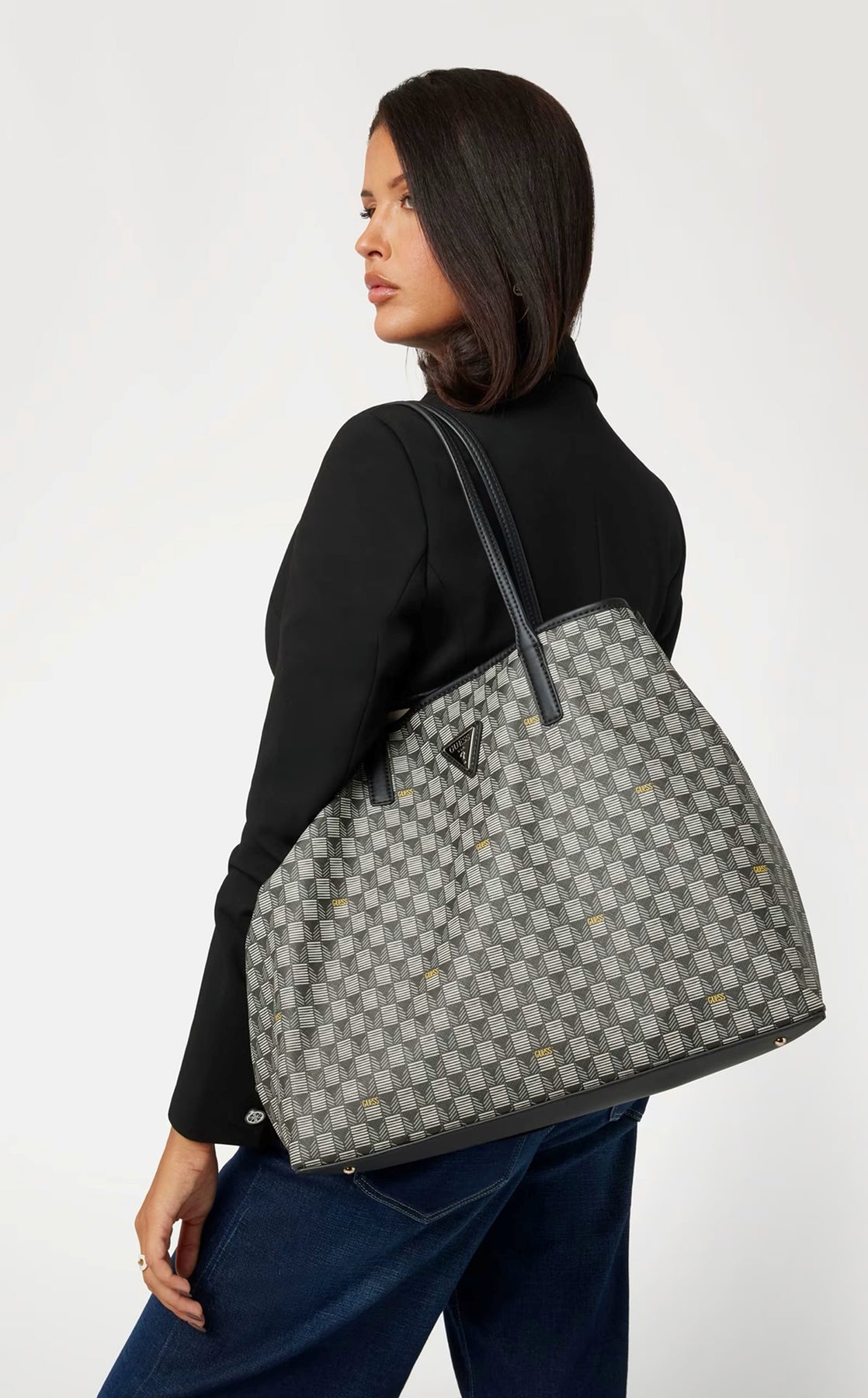 The outer material features a distinctive patterned finish, with interlocking geometric motifs in grey and black, accented by subtle hints of yellow for a unique and eye-catching appearance. The iconic Guess triangle logo is prominently displayed on the front, adding an unmistakable touch of brand prestige. The bag’s spacious main compartment ensures you can easily carry everything from your laptop and documents to personal items and shopping finds, making it an ideal companion for both work and leisure.