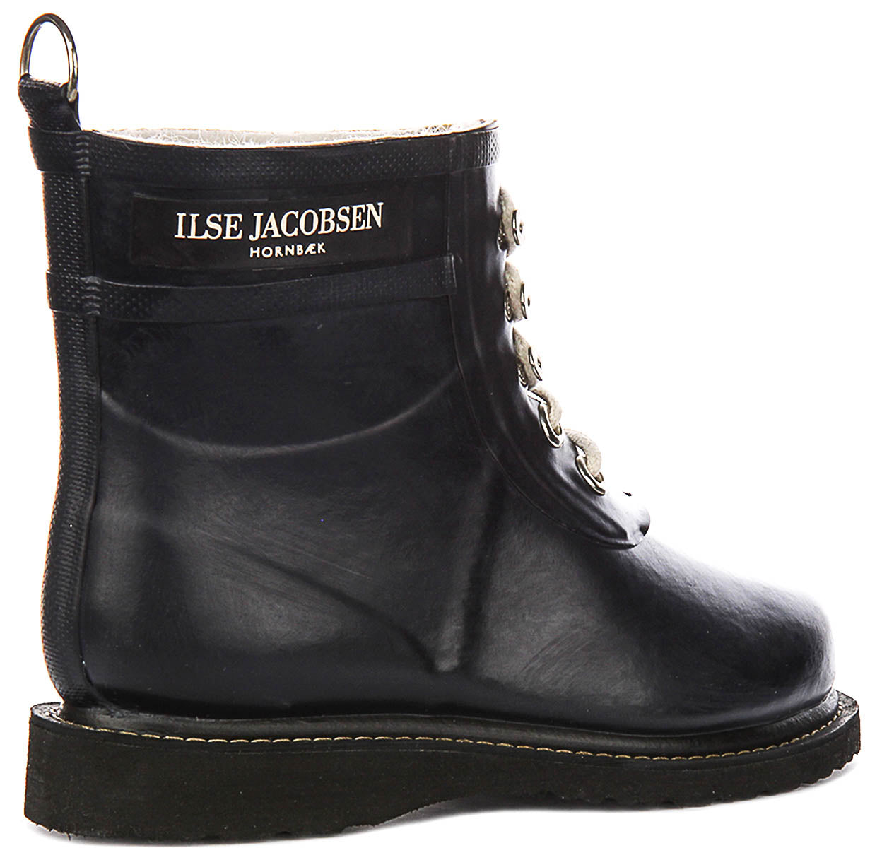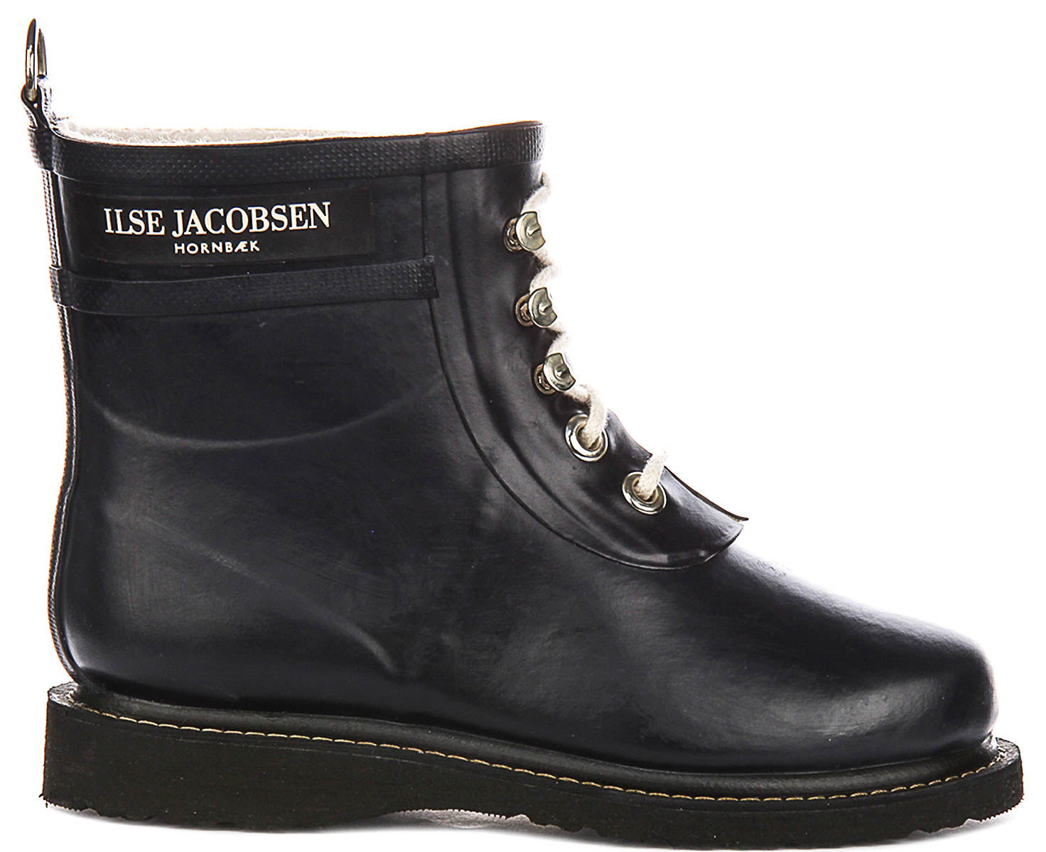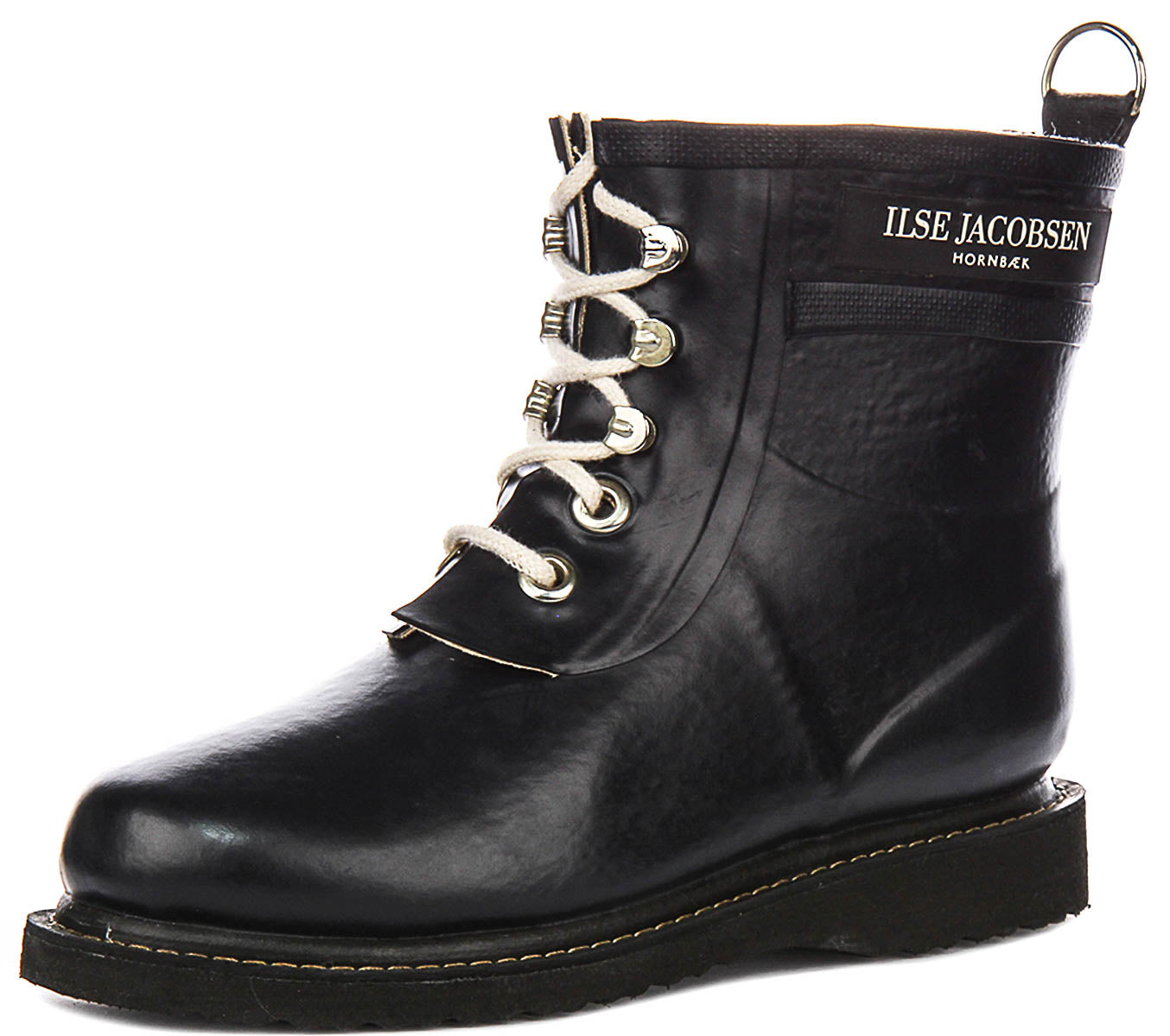 The design features a classic lace-up front, secured with sturdy, silver-toned metallic eyelets that beautifully contrast against the deep black rubber. Complementing this is a set of thick, cream-coloured laces, adding a touch of contemporary flair. The ankle-height shaft is adorned with the distinctive "ILSE JACOBSEN HORNBÆK" branding, proudly displayed on a subtle side band, signifying authentic Danish design. A practical metallic D-ring pull tab at the back ensures easy donning and removal.