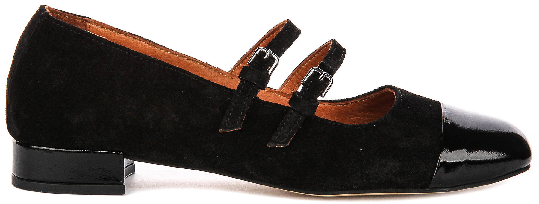 The design features two slender, adjustable straps across the instep, each secured with a petite metallic buckle. This double-strap detail not only enhances the aesthetic but also ensures a snug, supportive fit for all-day comfort. The low block heel adds just the right amount of elevation while maintaining stability and ease of walking.